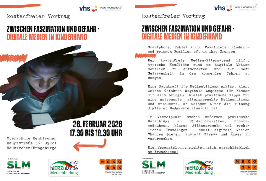 Sehr geehrte Eltern, gerne möchten wir Sie zum thematischen Medienelternabend zum Thema "Zwischen Faszination und Gefahr - digitale Medien in Kinderhand" einladen. Eine Teilnahme ist AUSSCHLIEßLICH mit Voranmeldung über die Schulsozialarbeit (bei Frau John per Mail m.john@gafug.de oder telefonisch unter 01704536506) möglich." Einlass ist ab 17:15 Uhr.
