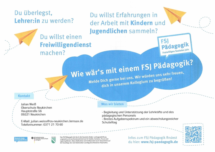 Für alle Schulabgänger, die überlegen ob der Lehrerberuf für sie das Richtige ist, bietet unserer Oberschule einen Platz für ein freiwilliges soziales Jahr Pädagogik an. Die Bewerbungsfrist für das Schuljahr 2006/27 endet am 30.04.2025. Nehmt dazu Kontakt zu unserem pädagogischen Assistenten Herrn Weiß auf. Er beantwortet Eure Fragen und unterstützt Euch bei Eurer Bewerbung bei der Deutschen Kinder- und Jugendstiftung, an die das Bewerbungsschreiben gerichtet werden muss.